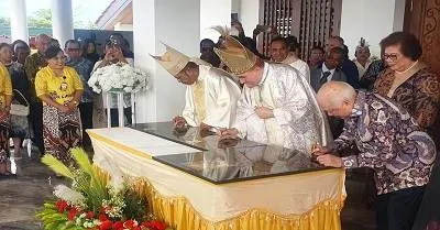 Dobo, Kepulauan Aru (DMS) – Duta Besar Takhta Suci Vatikan untuk Indonesia, Mgr Piero Pioppo, meresmikan dan mendedikasikan dua gedung gereja Katolik di Dobo, Kabupaten Kepulauan Aru, Maluku, masing-masing Gereja Santo Yosep dan Gereja Santa Maria de Fatima.