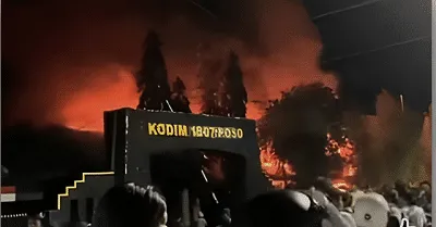 Dalam rekaman video amatir yang beredar, terlihat kobaran api melahap bangunan utama Kodim sementara sejumlah warga tampak panik melintasi area tersebut.