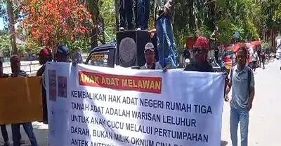 “Anak Adat Melawan! Kembalikan hak adat Negeri Rumah Tiga. Tanah adat adalah warisan leluhur untuk anak cucu melalui pertumpahan darah, bukan milik oknum dan antek-anteknya.”